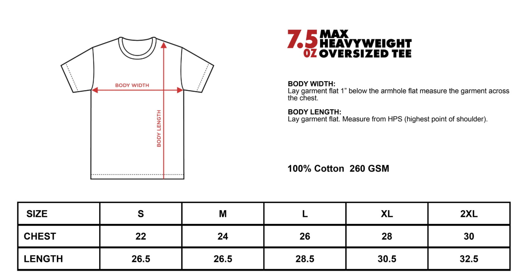 - Adult Tees printed on a garment dyed 7.5 oz oversized heavyweight Shaka Wear Tee